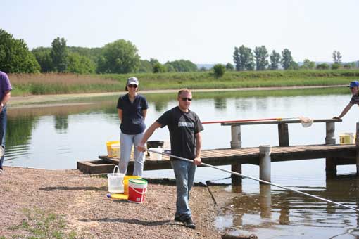 Mir fiel angenehm auf, dass der Stammtischleiter pünktlich zum Start blies. Im Autokorso fuhren wir zur Kiesgrube. Nun ging alles ganz schnell. Im Nu waren die Eimer und Kescher parat. Die ersten Fänge wurden eingebracht. Toll! Die Netze und die Eimer waren schnell gefüllt. Das geplante Frühstück war eher rudimentär. Zum Glück konnte ich auf meine körperlichen Reserven zurückgreifen.